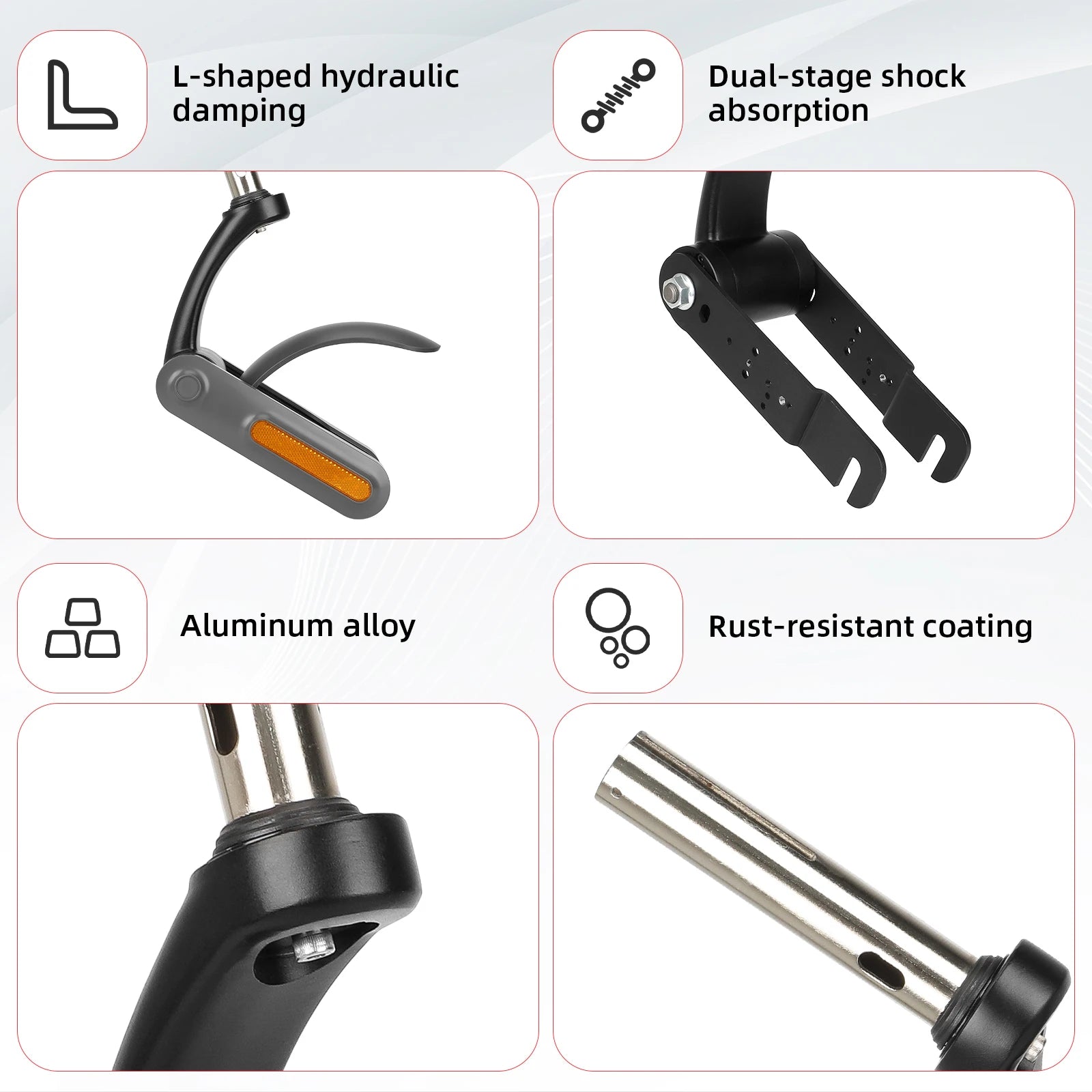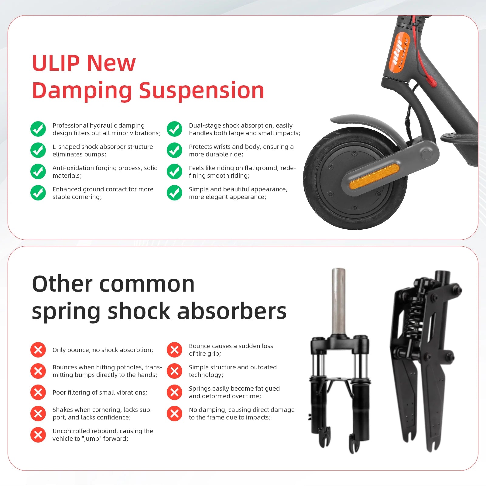 Marre des trous, pavés et chocs à chaque trajet ? Cette suspension avant Ulip est conçue pour les modèles Xiaomi M365 / Pro / 1S / Mi 4 / 4 Pro / Max / G30 / D / E / LP / etc.. Elle t’offre une conduite plus douce, plus stable, et surtout plus confortable.